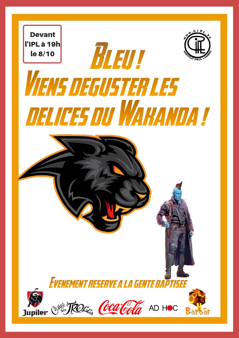 Non classé Les délices du Wakanda – Rallye Crasse 6 octobre 2018 / BLEU ! Viens savourer les mets les plus délicats du Wakanda ce lundi 8/10 dès 19 heure ! Anciens, poils, plumes et externes venez soutenir votre fillot/fillote ! EVÈNEMENT RÉSERVÉ À LA GENTE BAPTISÉE